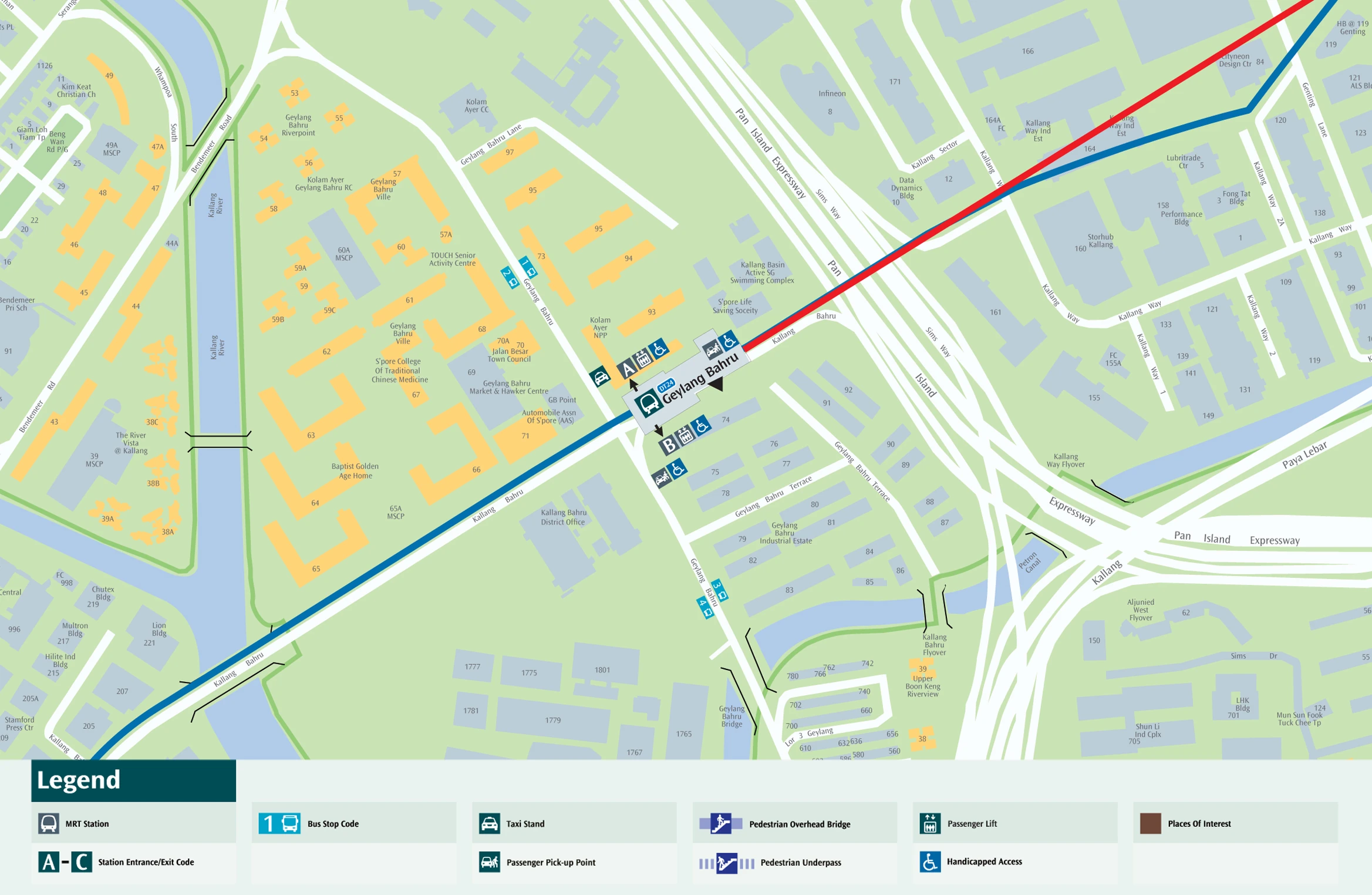 There is also a swimming complex near the station, called the Kallang Basin Swimming Complex. The station is within the vicinity of Kallang and Boon Keng. It is a 10 minutes walk from this station to Kallang and Lorong 1 Geylang Bus Terminal.