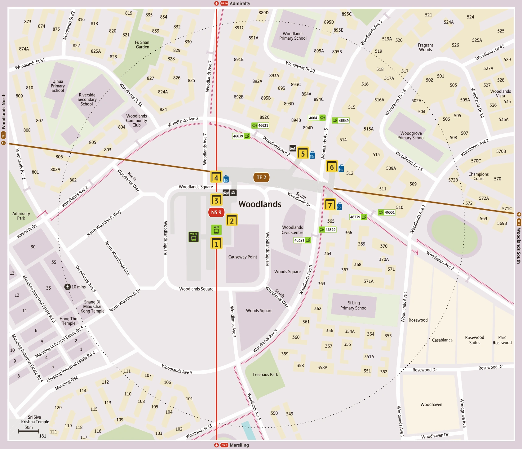 Woodlands station, as the name suggests, is located in the Singapore residential town of Woodlands. The NSL station is on a 6 m (20 ft) hilllock surrounded by Woodlands Square, while the TEL station is located between Woodlands Avenue 2 and Woodlands Square. The NSL station is directly above the Woodlands Integrated Transport Hub (previously Woodlands Regional Bus Interchange) and is beside the Woodlands Temporary Bus Interchange. Other surrounding developments include Causeway Point and Woods Square and schools such as Woodlands Primary School and Riverside Secondary School.